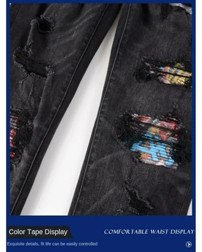 More information about Jeans Pants Trouser Denim Men Perforated Elastic Stretch Slim Fit Street Trendy Worn Hole Black Personalized Printed Graffiti Casual Small Leg(Black,33)