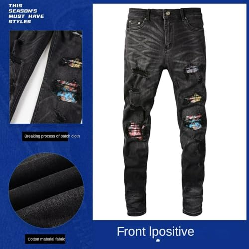HOT ! Jeans Pants Trouser Denim Men Perforated Elastic Stretch Slim Fit Street Trendy Worn Hole Black Personalized Printed Graffiti Casual Small Leg(Black,33)