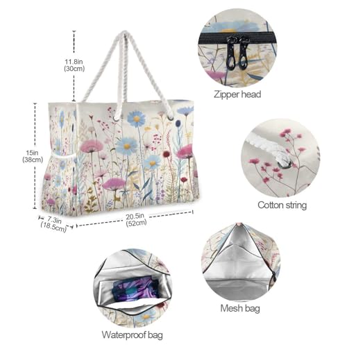 HOT ! Colorful Wild Flowers Beach Bag & Travel Tote Bag Large Sandproof Wet Pouch for Gym Travel, Lightweight Outdoor Bag