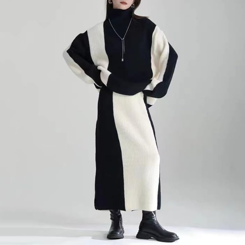 • Women's Color Block Sweater Set 2 Piece Outfits Mock Neck Pullover Sweater Knitted Midi Pencil Skirts Set