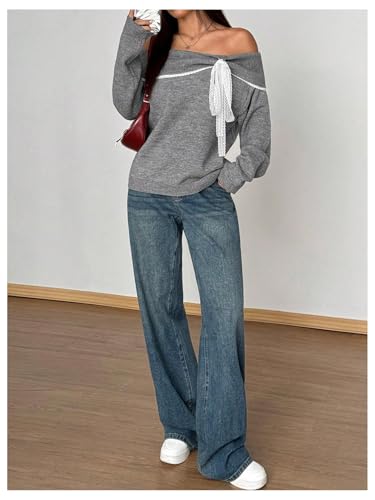 HOT ! Verdusa Women's Bow Off The Shoulder Pullover Sweaters Y2k Lace Long Sleeve Knit Tops