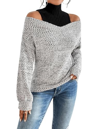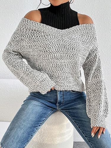 HOT ! GORGLITTER Women's Cold Shoulder Long Sleeve Oversized Patchwork Sweater Trendy High Neck Fall Cozy Chunky Sweater Top