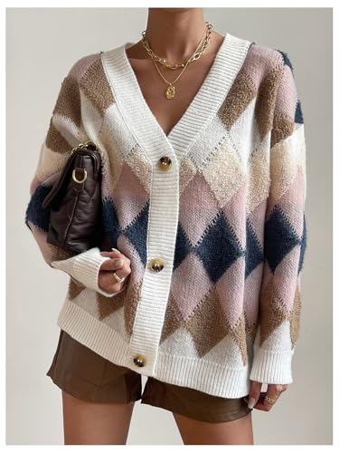 SOLY HUX Women's Argyle Cardigan Plaid Button Down V Neck Long Sleeve Casual Cardigans Sweater 1