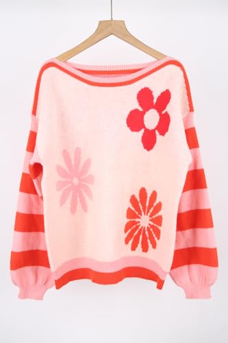 chouyatou Women's Color Block Striped Long Sleeve Sweaters Daisy Flower Pullover Sweater Jumper Tops 1