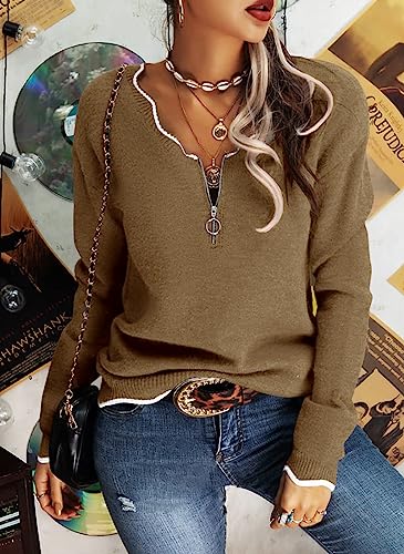 Hongqizo Women's V Neck Long Sleeve Sweater Half Zipper Knit Sweater Casual Cricket Stripe Jumper Pullover Knit Tops 5