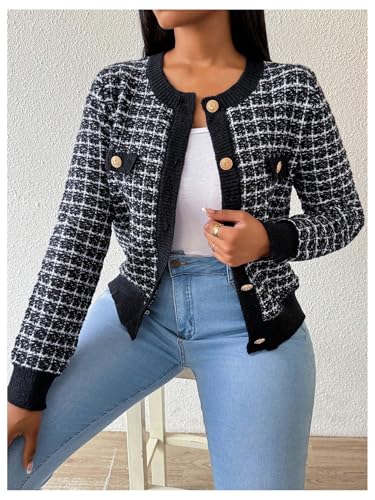 HOT ! MakeMeChic Women's Plaid Print Crew Neck Button Down Long Sleeve Cardigan Sweater