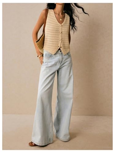 HOT ! MakeMeChic Women's Sleeveless Crochet Sweater Vest V Neck Button Down Cardigan Knit Tops