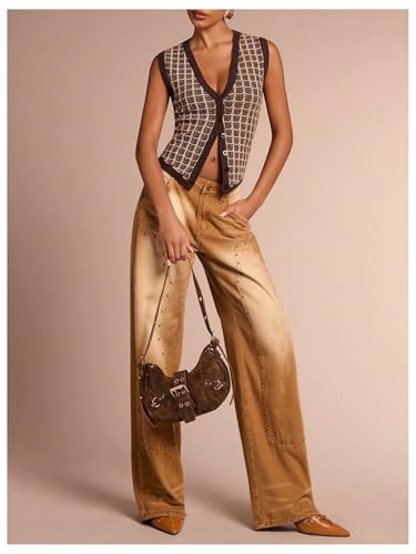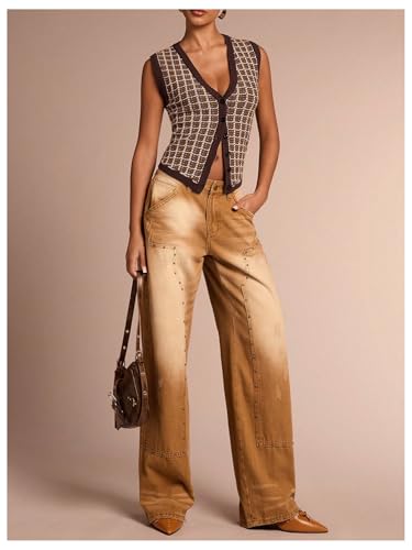 HOT ! MakeMeChic Women's Plaid V Neck Button Down Sweater Vest Sleeveless Knitwear