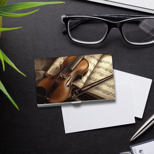 HOT ! Slim Metal Business Card Holder - Violin And Book Aluminum Alloy Card Case with Buckle Closure, Holds 20 Cards & Cash, Professional Credit Card Size ID Holder for Men Women Gift