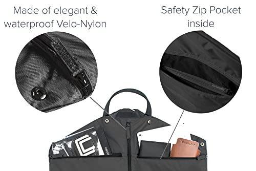 • THOUGHT THROUGH FUNCTION: The entire Garment Bag only weighs 500g for light traveling in your carry-on luggage. Due to the smart interior design, you can easily pack 3 entire business outfits with all accessories such as belt, underwear, tie, bowtie, dress-shirt, pocket square, cufflinks and of course your suit or dress. In the large back pocket, you can fit a 15” Laptop, documents or magazines. Two zip pockets for your iPad, tablet and cosmetics for fast and easy access at the security check.