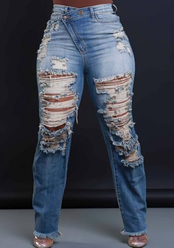 More information about LETSVDO Women's Skinny Ripped Jeans High Waisted Straight Leg Distressed Raw Asymmetrical Strechy Denim Pants