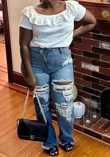 LETSVDO Women's Skinny Ripped Jeans High Waisted Straight Leg Distressed Raw Asymmetrical Strechy Denim Pants 6