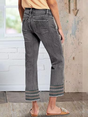 HOT ! Flamingals Straight Leg Jeans for Women Low Rise Cropped Jeans Wash Embroidery Raw Hem Denim Pants Gray S