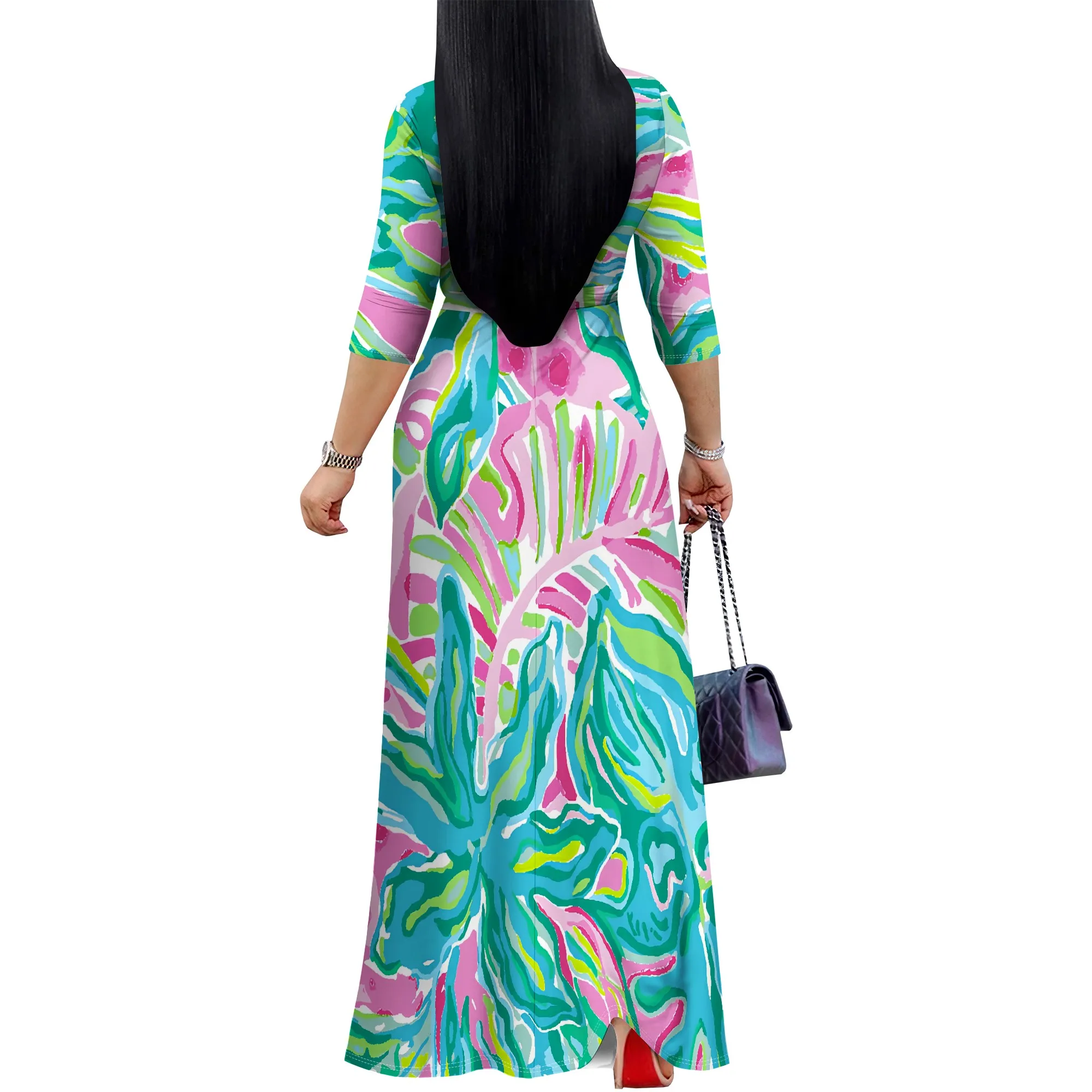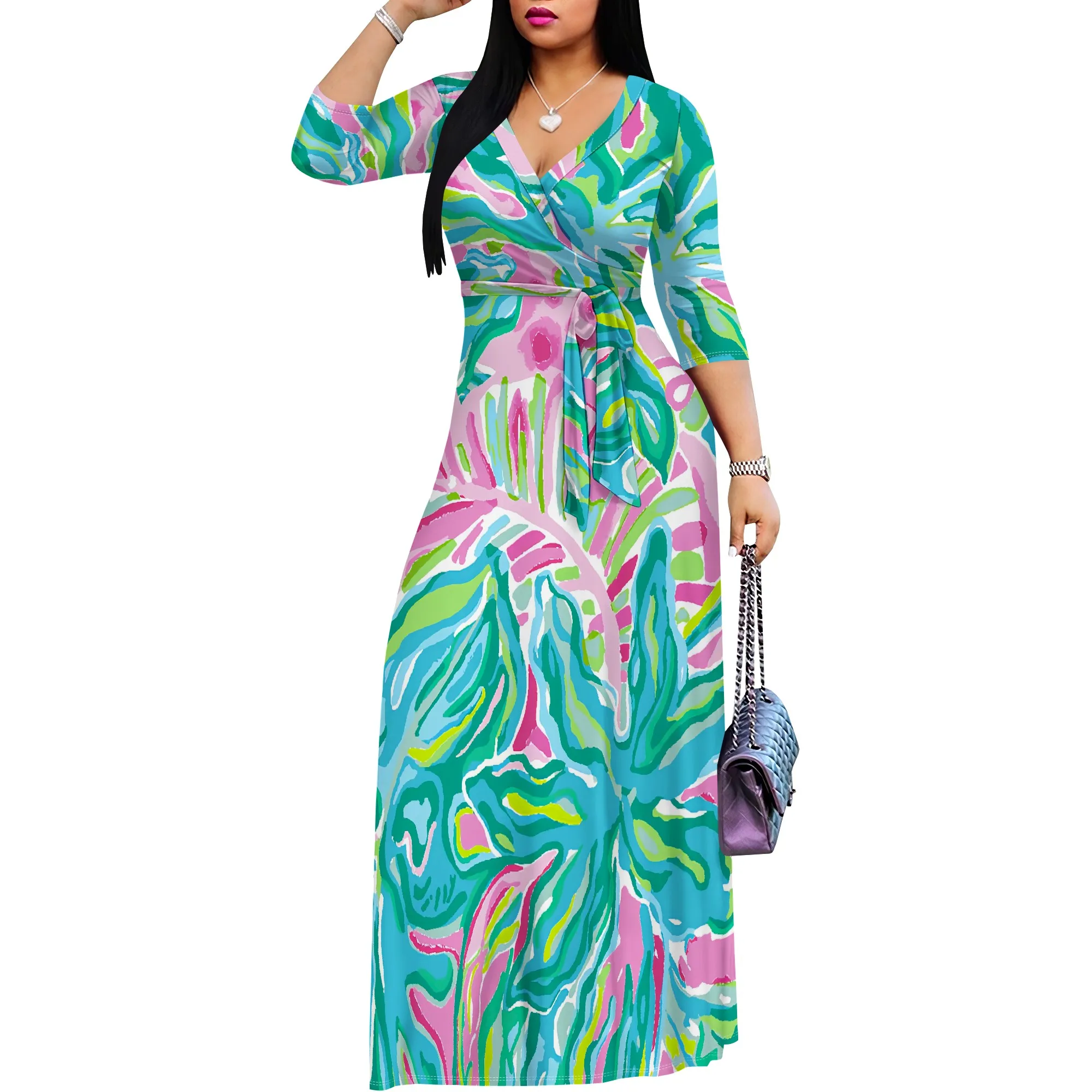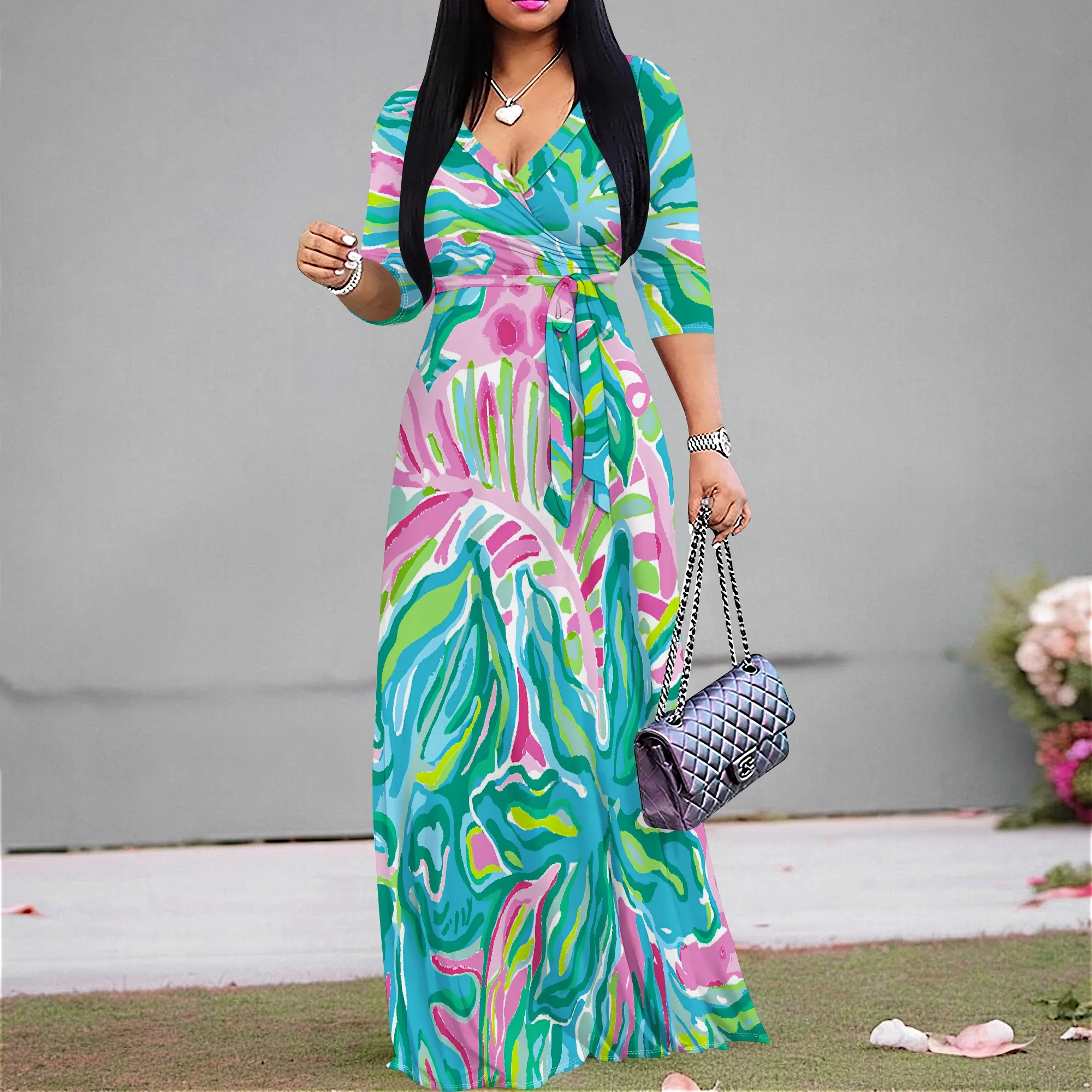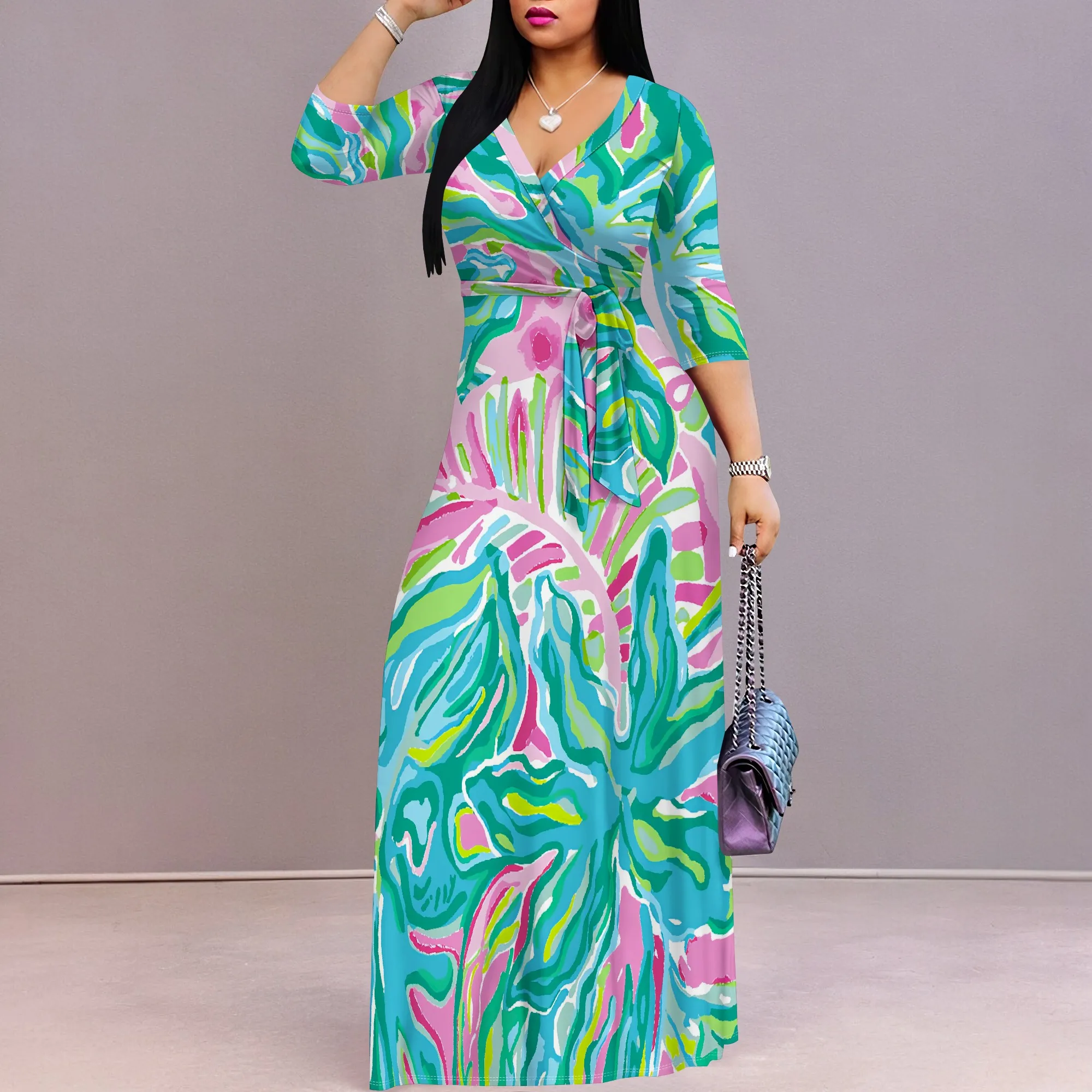 Women's Plus Size Abstract Print Maxi Dress - V-Neck 3/4 Sleeve Belted Colorful Summer Party Gown - Elegant Flowy S-3XL