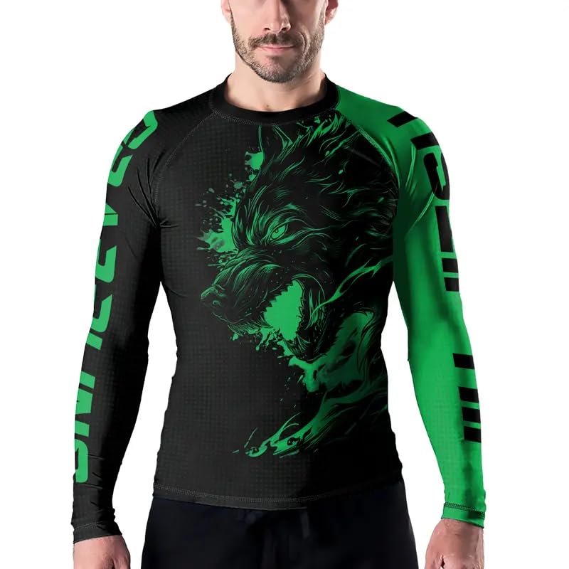 HOT ! Wolf Men's BJJ Jiu Jitsu Rash Guard, Long Sleeve Compression Shirt for MMA Muay Thai Grappling