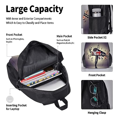3-In-1 Backpack Bookbag Set,Microphone With Music Note Print Casual Travel Backpacks,With Pencil Case Pouch, Lunch Bag 6