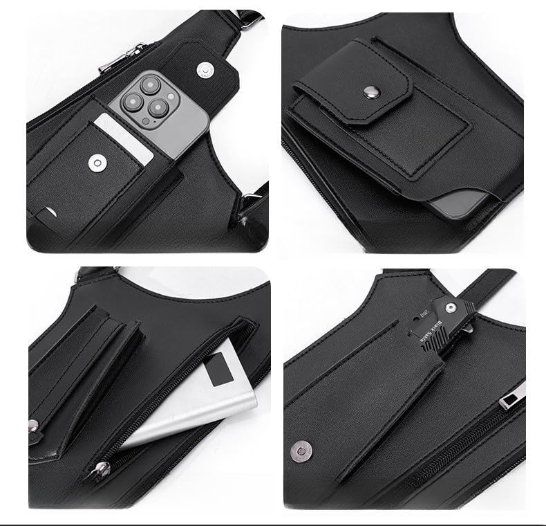 • This Double Shoulder Armpit Bag is equipped with multiple zipper compartments and pockets, allowing you to neatly organize essential items such as tools, gadgets, mobile devices, power banks, wallets, keys, pens, cash, and more—ideal for both outdoor excursions and everyday use