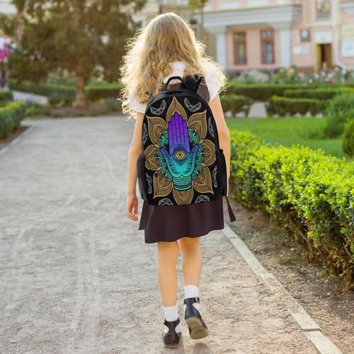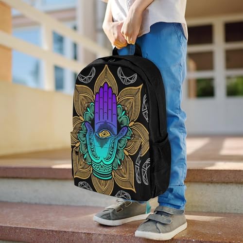 Supdreamc Men Women Polyester Multicolor Hamsa Hand Ornate Amulet Lotus Ethnic Indian Art Casual Daypack Large Capacity Carry On Bag With Adjustable Shoulder Straps for Camping Work Running 3