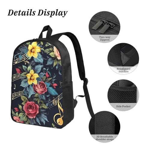 • Laptop Compatible of Backpack: The Lightweight Musical Note Floral print Bookbag includes a spacious compartment that can accommodate a 15-inch laptop, making it suitable for both work and leisure activities.