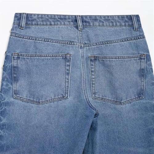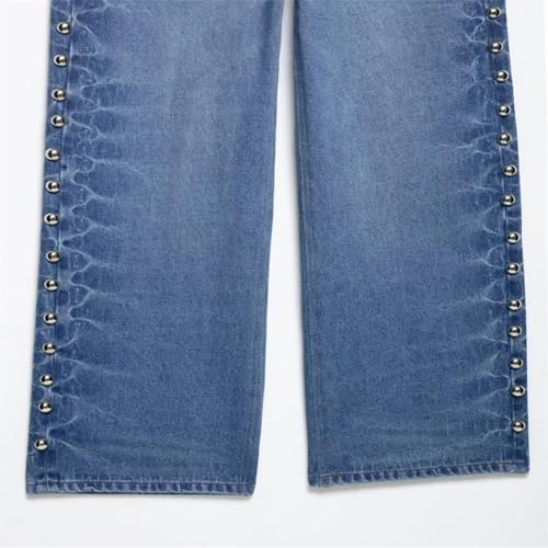 Women Spring Fashion Vintage Mid Waist Side Rivet Loose Straight Denim Pants 6