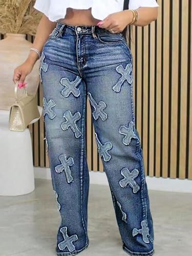 high Waisted Jeans for Women Casual Vintage Waisted Wide Sexy Straight Leg for X Embroidery Bule Leg Jeans 4