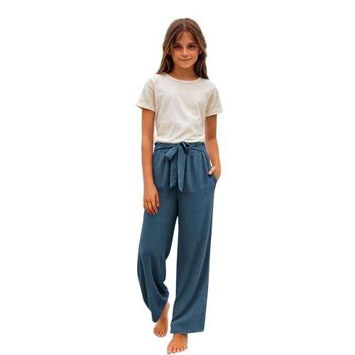 Kids Girls Cotton Linen Wide Leg Pants Casual Ruffled Loose Flowy Stretchy Cropped Sweatsuit Solid Lightweight Belted 6