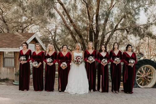 HOT ! Women's Velvet Long Sleeve Bridesmaid Dresses Long V Neck High Slit Formal Evening Gowns with Pockets