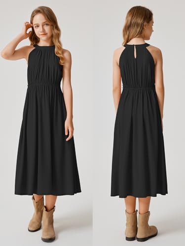 Girls Halter Neck Rayon Woven Floral Printed Solid Color High Waist Midi Belted Party Casual Dress with Pocket 5