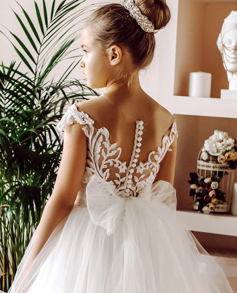 HOT ! JISISANG Flower Girls Lace Tulle Ball Gowns with Bow-Knot First Communion Dresses Tutu Pageant Dress for Wedding Princess