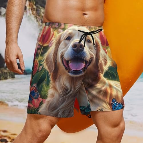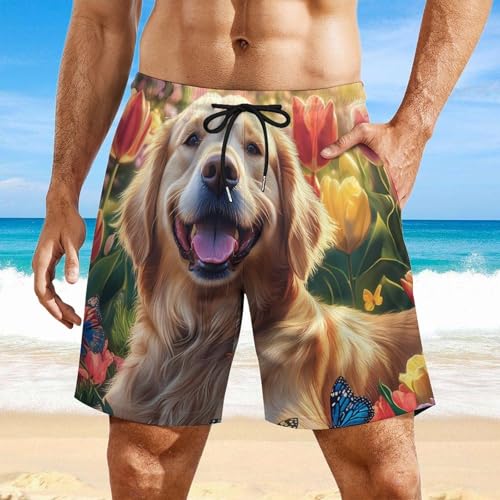 HOT ! Retriever Sitting in Tulips Flower Mens Swim Trunks with Quick-Drying Lining Beach Shorts for Outdoor Sports