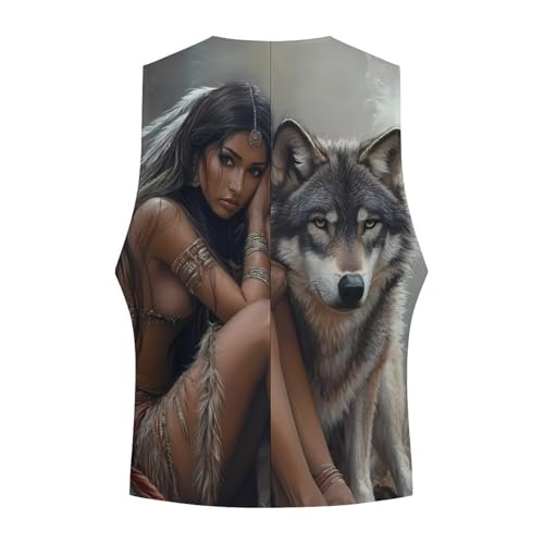 Indian Maiden And Wolf Native Am-erican Mens Slim Fit Suit Vest Dress Waistcoat Casual Business Vest 3