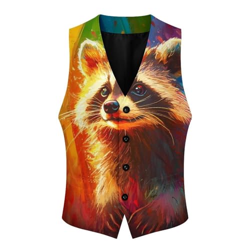 HOT ! Feral Raccoon Rainbow Suit Vest for Men Slim Fit Sleeveless Jacket V Neck Business Waistcoat Button Up Dressy Top