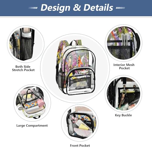 HOT ! Colorful Bird Garden Clear Backpack - Stadium Approved Large 15.7-inch Waterproof Transparent Bag for Sports, Concerts, Work, Travel#150