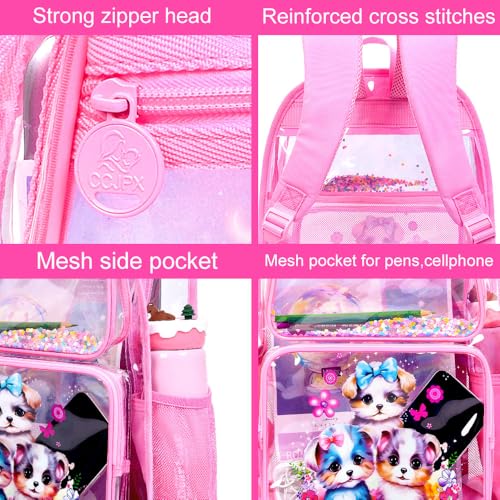 • Transparent Backpack for Girls to Love: The cute dog is a happy companion for her to grow up with. With the matching lunch box and pencil bag, she'll be proud to own this kids clear backpack set.