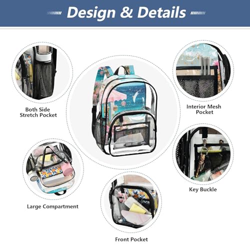 • Size: Measuring 10.6 x 7 x 15.7 inches,Our School Backpack Clear includes a main compartment, a medium front compartment features with mesh slots and key buckle for small items. Plus, the see through backpack offers two side mesh pockets for water bottles or umbrellas.