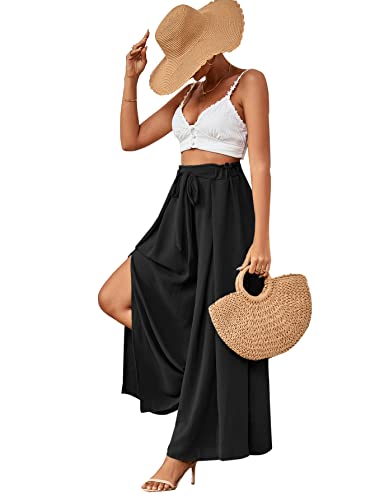 HOT ! LYANER Women's Tie Front High Waist Side Split Slit Flowy Wide Leg Pleated Pant with Belt