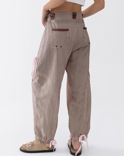Women Striped Barrel Pants Drawstring Casual Baggy Boyfriend Y2K Streetwear Parachute Pants with Pockets 3
