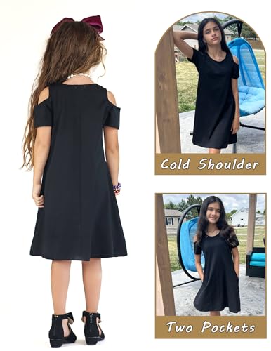 More information about Arshiner Girls Summer Dress Short Sleeve Cold Shoulder Solid Color Swing Casual Dresses with Pockets
