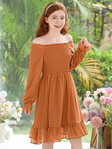 HOT ! Girls Long Sleeve Dress with Puff Sleeves & Ruffle Hem, Christmas Holiday Party Dress for Fall Winter, Sizes 6-15