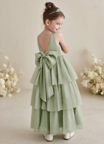 HOT ! Tiered Girls Flower Girl Dress with Bow Knot Crewneck Backless A Line Birthday Formal Party Dress