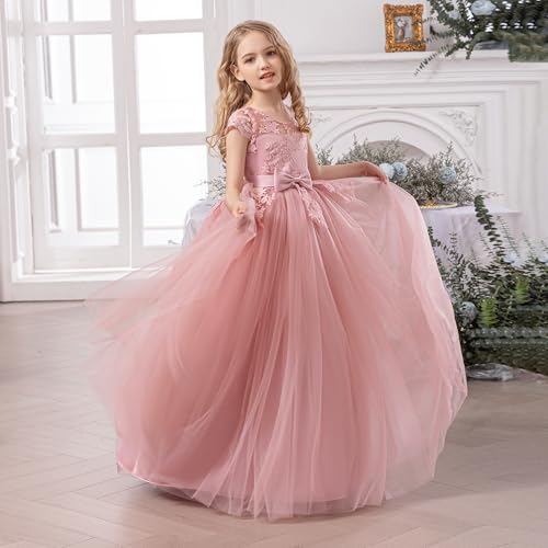 Flower Girl Dress with Bow Tie Pearl Embroidery Lace Tulle Satin Wedding Guest Party Birthday Pageant Gown Kids 7
