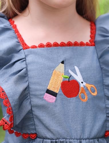• Back to School Dresses Design: Toddler pencils dress kids back to school dress, cute kindergarten outfits for girls. Flutter sleeve square neck demin dress embroidered with apple, pencil or scissors on the front, the ruffle dress reminds your girl of her school life. Trimmed with red lace at sleeves and neckline. Elastic smocked back ensure the best fit to the body. Lovely first day of school outfits for girls, cute summer outfits, picture day outfits for school, back to school apple dress etc.