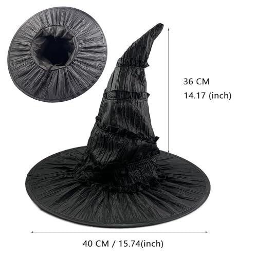 • DRESS DESIGN: You will get a piece of elegant black ruffled dress with textured fabric for a classic witch appearance and an elegant satin cape.Includes a tall, pointed witch hat with distinctive spiral ribbing detail for an authentic magical look.