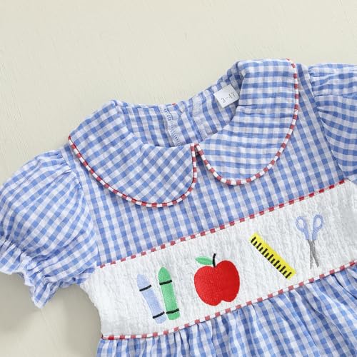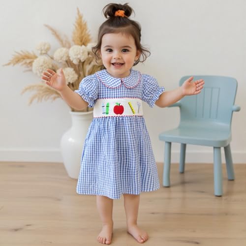 • Feature: smocked toddler girl clothes back to school, toddler girl pre k clothes, toddler girl plaid dress, peter pan collar dress girls. Doll Collar, embroidery of crayon, apple, ruler, scissors, must make your kid lovely
