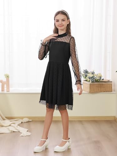 GORLYA Girls Polka Dot Mesh Long Sleeve Contrast Mock Turtleneck A-line Formal Party Tulle Dress 6-16Y 6