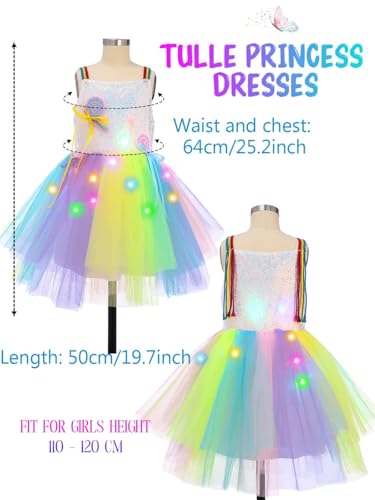 • Light up girls dress is suitable for girls with heights ranging from 110 to 120 cm. Sparkly glow dress are ruffle design with soft lining, hidden zipper closure and layered rainbow tulle.