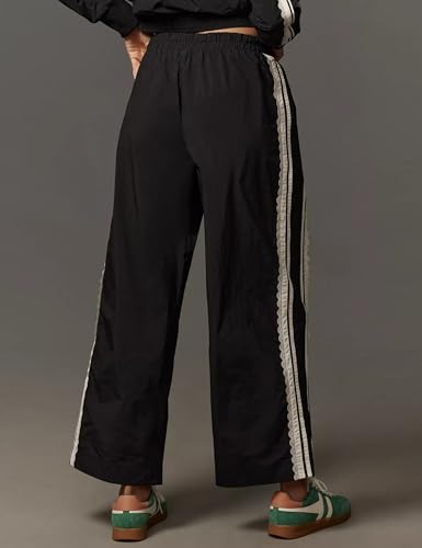 • Features: Side stripes with lace trim, side slant pockets, pull-on style, elasticated waistband and drawstring, high rise parachute pants, ankle length