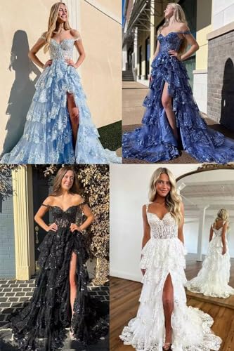 • Features: Tiered lace tulle prom dresses long for women, spaghetti straps corset ball gown, princess fairy dress for teens, sparkly formal evening party gown, bodice, corset back, A-line, sleeveless, high side slit/split, full lining, floor length with train, lace up back, built in bra. The elegant women's gown, you will receive many compliments on this beautiful dress.