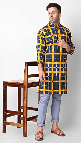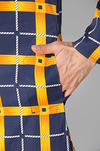 SKAVIJ Men's Printed Checkered Cotton Tunic Casual Kurta Shirt Great (Navy Gold, Large) 5