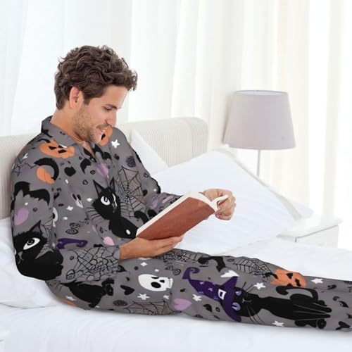 Mens Long Sleeves Pajama Set Black Funny Cat Halloween Pattern Cozy Two-Piece Loungewear For Nighttime Comfort,Casual Wear 7